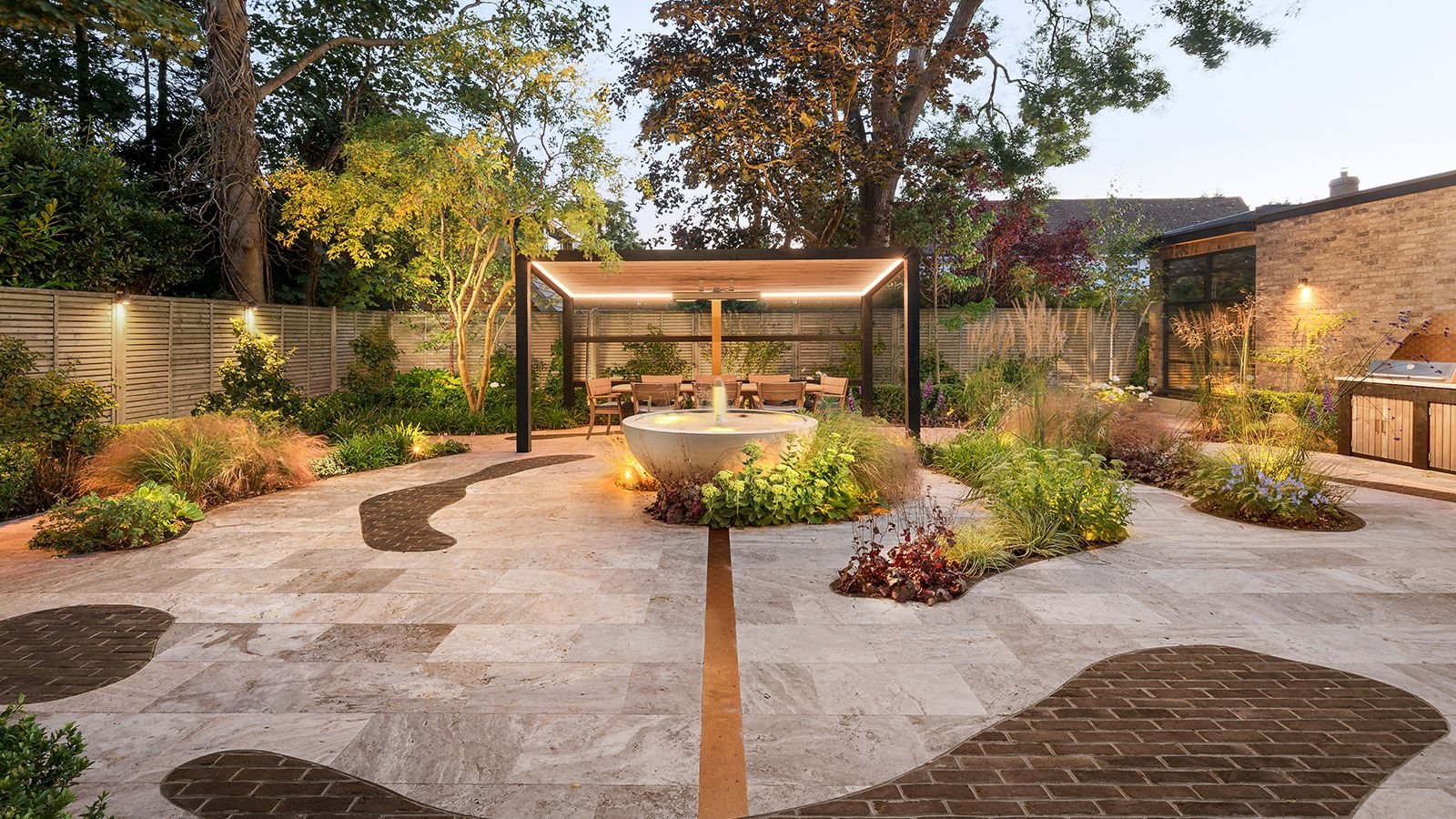 In a front garden design, consider: brass path lights along the main approach path at ground level, brass spotlights uplighting the two or three most prominent plants or architectural features, and a brass wall lantern or pair of flanking wall fixtures at the entry door. This three-level lighting creates a complete visual environment that reads richly at night.