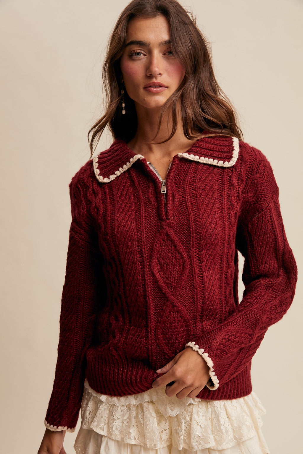 Scallop Trim Cable Knit Half-zip Sweater