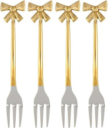 5"L Stainless Steel & Brass Appetizer Forks w/ Gold Finish Bow Handles, Set of 4 in Printed Drawstring Bag