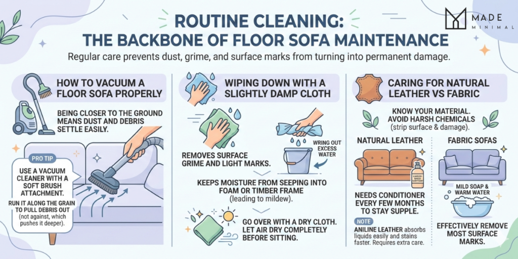Regular cleaning prevents dust, grime, and surface marks from turning into permanent damage. For most floor sofas, that means three things: vacuuming, wiping down, and material-specific care.